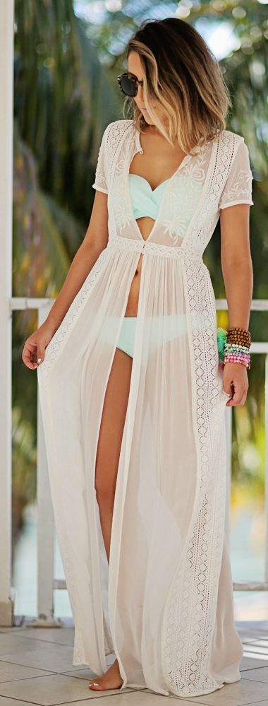 White, cotton, long dresses, crochet details, oversized buttoned downs, frilly baby doll dresses, long simple kaftans, kimonos and tunics are all on my top list. Light weight and long sleeved, boho-ing it or not, the plainer the better. Neutrals are always a safe option and they don’t clash with your choice of swim wear or the colour of your toe nails. A white, sheer, cotton, smock top with a pair of jean shorts is an easy, ready- to-go choice with each item having beach babe stamped all over it. When worn alone they have an add on value.