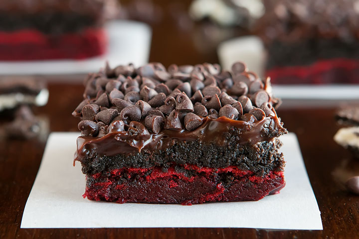 (These four-layer cake mix brownies start with a layer of ultra, soft red velvet brownies, but are taken to the next level with Oreo truffle filling, then topped with sinfully rich chocolate ganache and mini chocolate chips. Total heaven in every bite!!!) kevinandamanda.com