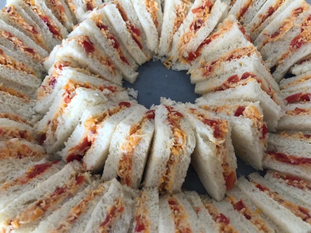 Spread the mixture between slices of buttered bread. Cut away the crust and slice into even sized triangles.